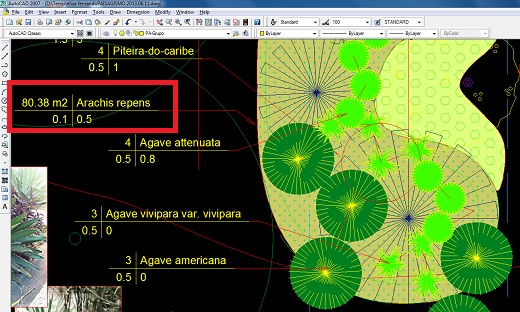 Lo que pasó en el proyecto anterior fue que cuando se copió el área del proyecto para el diseño de localizacion anterior, fue eliminado solamente el area sombreada, por eso elborde fue mantenido, como las informaciones de cuantificación quedan em el borde, el AutoLANDSCAPE al generarla tabla de cuantificación, suma las areas del item Arachis repens, lo que generó una cuantificación errada em relacion al proyecto. Ademas de esto, en el lado derecho de la imagen percebimos pequeñas areas donde fue insertado el item y despues eliminando solamente las areas sombreadas.