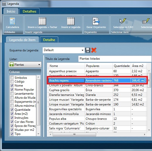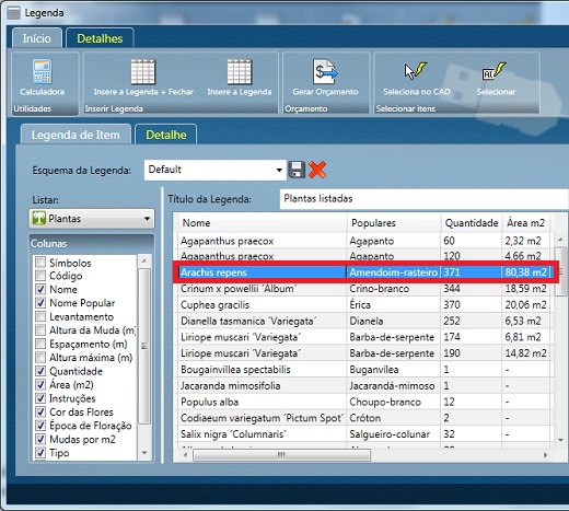 Para hacer un mejor análisis e identificar el error vamos a hacer lo siguiente, en la pestaña de tabla de cuantificación seleccionaremos el elemento Arachis repens y haga clic en el botón Seleccionar en el CAD. En la barra comando do CAD será pedido para seleccionar el area para la localización del item, clicaremos em la tecla enter paraque el AutoLANDSCAPE seleccione toda el area de CAD, Luego el AutoLANDSCAPE seleccione el item, percebimos que este item esta insertando em otraas areas, ademas del area sombreada.