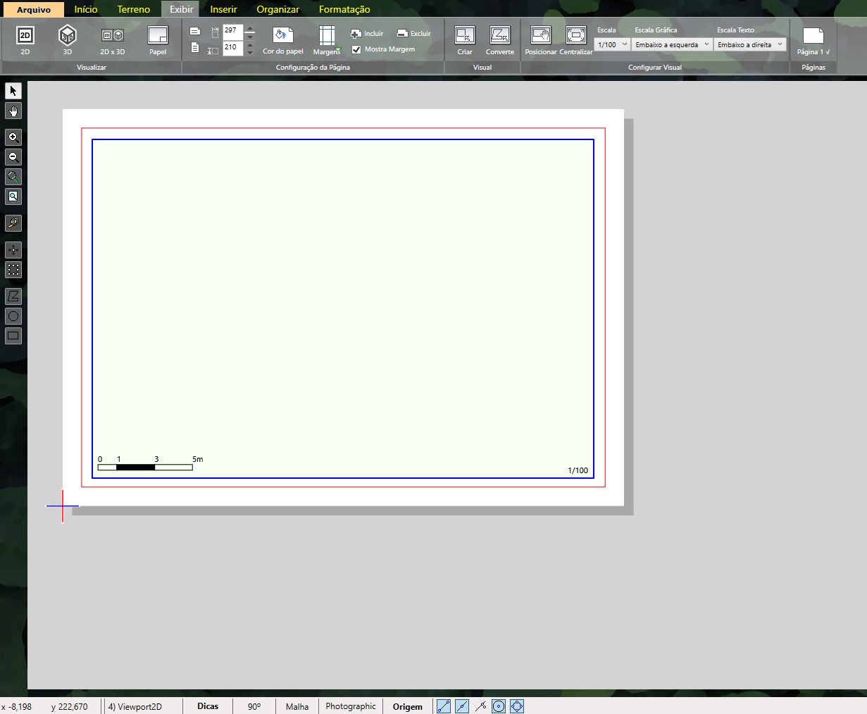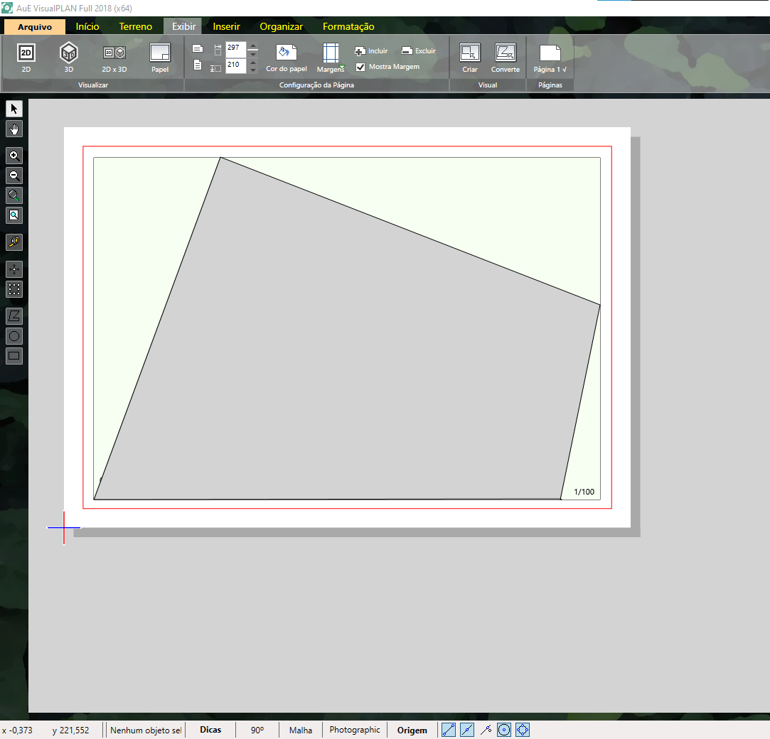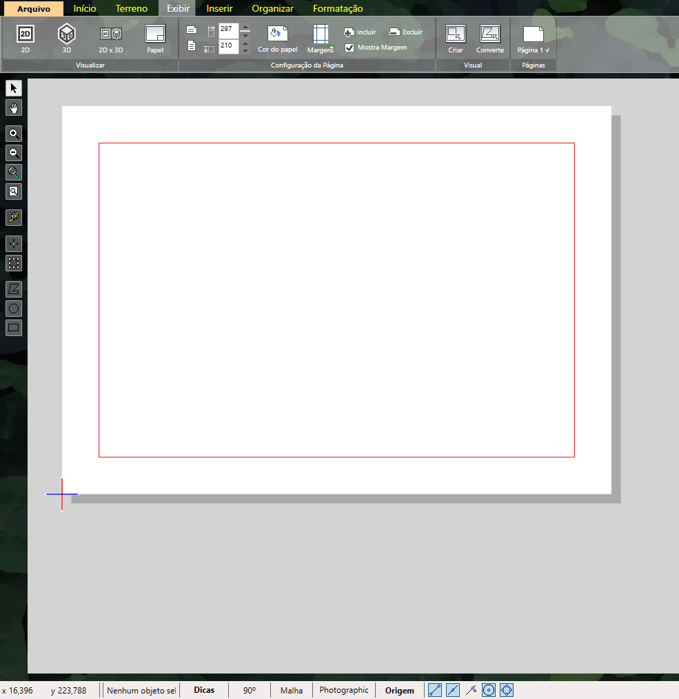 Para realizar o procedimento devemos clicar no botão Criar. Em seguida crie o contorno da viewport fazendo um retângulo que tenha tamanho adequado para caber o desenho, além de aproveitar ao máximo a área da folha. Deixe a opção Mostrar margem ativa para que seja possível ter uma referência para a criação da Viewport.