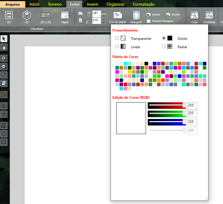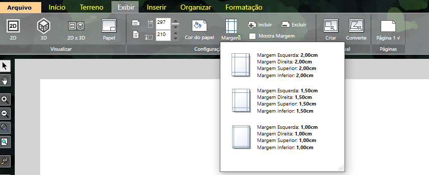 Para inserir margens na prancha clique no ícone Margens e selecione alguns dos padrões disponíveis. Se quiser deixar a margem visível todo o tempo marque a opção Mostrar Margem.