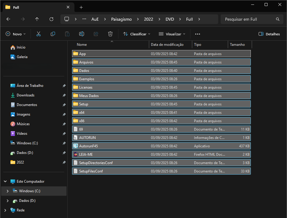 2) Vá até a pasta onde estão os arquivos de instalação: C:\ProgramData\AuE\Paisagismo\2022\DVD\Full